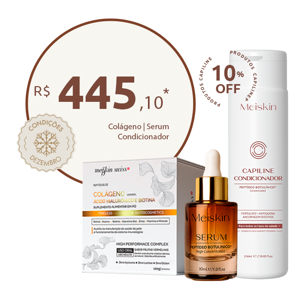 Condicionador: Após lavar o cabelo com shampoo Antiqueda Meiskin, aplique o condicionador nos fios e massageie. Deixe agir de 1 a 3 minutos e enxágue bem.