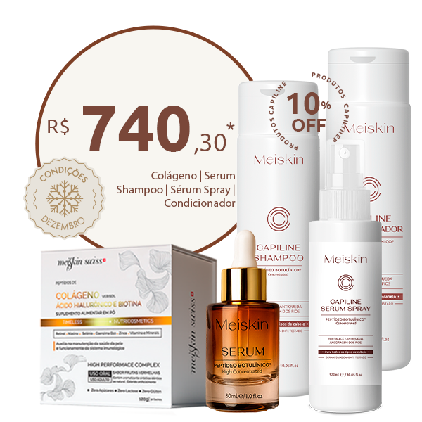 Kit composto por SERUM, COLÁGENO, CAPILINE SÉRUM SPRAY e SHAMPOO com 10% OFF